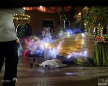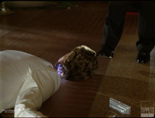 Comp At a point in the movie the robot Wives get reprogrammed and the look of this effect was achieved in 2d land with the help of 3d match moved elements. The plate was of the actress snapping her head back. The effect calls for a charge of energy that travels from the brain down through the body underneath the skin into the feet, which ends in a flash. Leading and trailing edge treatments were created using mattes from elements and edge detect techniques, as well as some plate distortion. The look was for light to bury underneath the skin. Interaction with the plate includes blue bounced light and white light during the flash contaminating the environment. |