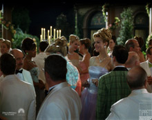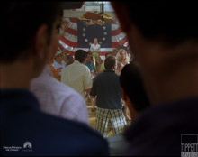 Comp This shot was entirely mine and cut directly with sd70. I performed some rig removal for a huge card cutout reference for the actors for placement of the spinning actress. I generated roto for the actors in front of the actress. The actress was entirely CG in this shot, except for once she lands I rock and rolled on a practical plate of the actress turning on a platform for reference. I used this to put the real actress’s face on the cg body. The hair in this shot was created using 2d green screen elements. For the spin I created a loop of about 12 frames of spinning hair retimed to ramp up in speed to match the performance. Tracked it on the head and tweaked to make it look right. Once she lands I switch over to another hair element that does the shampoo commercial whoosh, again locking it down to match the movement of the cg character. Getting the 3 main elements of this shot to work as one proved to be a big challenge in this shot, being the cg character, the practical face, and the practical hair. |